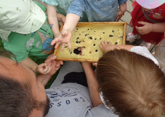 Die Kinder staunten, was es für verschiedene Bienen gibt. Die bekannteste ist wohl die Königin. Dazu kommen noch die Arbeiterinnen, die Drohnen und noch mehr. Die Kinder lauschten den Erzählungen und sahen dem Treiben der Bienen zu. Ganz intensiv suchten sie die Königin. Trägt sie eine Krone, nein einen gelben Punkt. Eine echte Bienenwabe in die Hand nehmen, sie untersuchen und den leckeren Honig kosten, all dies war an diesem besonderen Vormittag möglich.