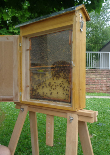 Unser Imker überraschte die Kinder mit einem Bienenschaukasten. Sicher und ohne Angst konnten sie die Bienen beobachten. Dazu gab es viele interessante Informationen.